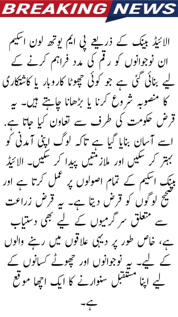 The PM Youth Loan Scheme through Allied Bank is made to give money support to young people who want to start or grow a small business or farming project. This loan is supported by the government. It is made easy so that people can improve their income and create jobs. Allied Bank follows all the rules of the scheme and gives loans to the right people. The loan is also available for agriculture-related activities, especially for those living in rural areas. This is a good chance for youth and small farmers to improve their future.